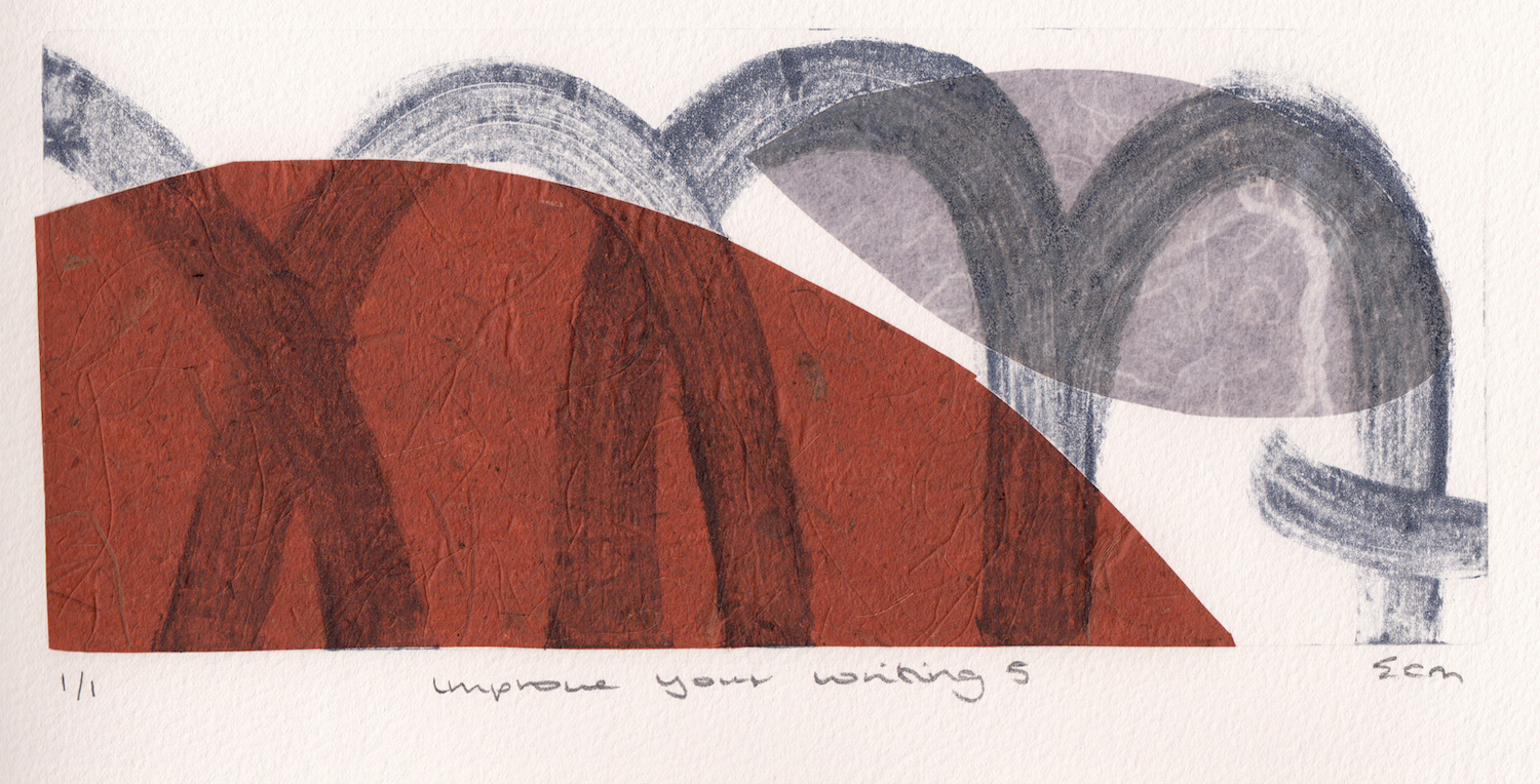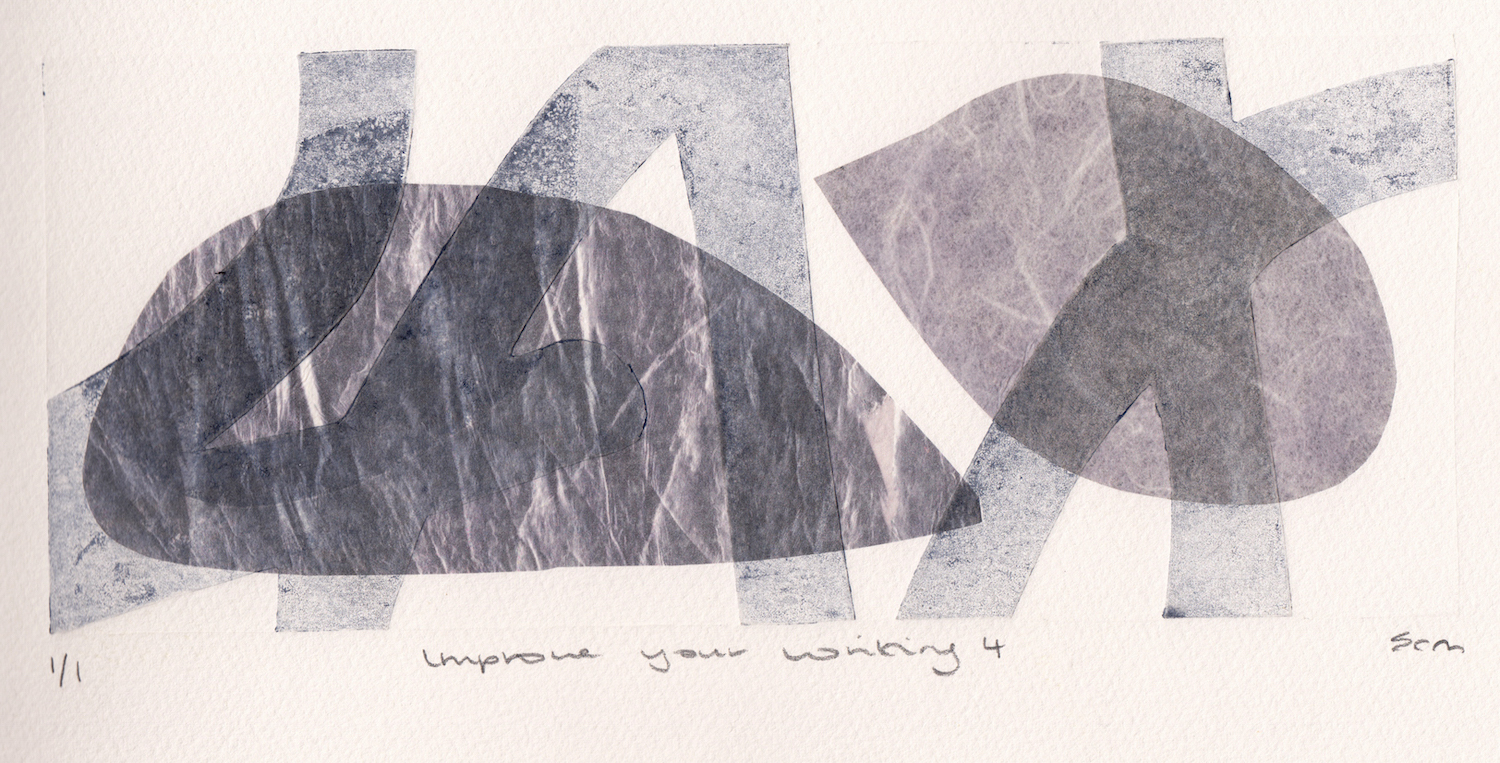 Emma’s work is inspired by the many ordinary, everyday things that unexpectedly catch her attention, and the thoughts and feelings these experiences evoke. She works with printmaking, photography and collage and is particularly interested in abstraction, her sense of touch and the physicality of processes and materials. Improve Your Writing is a reflection on the process of learning to write and explores the gestures that she has developed over a lifetime which enable her to convert her thoughts into tangible words on the page.