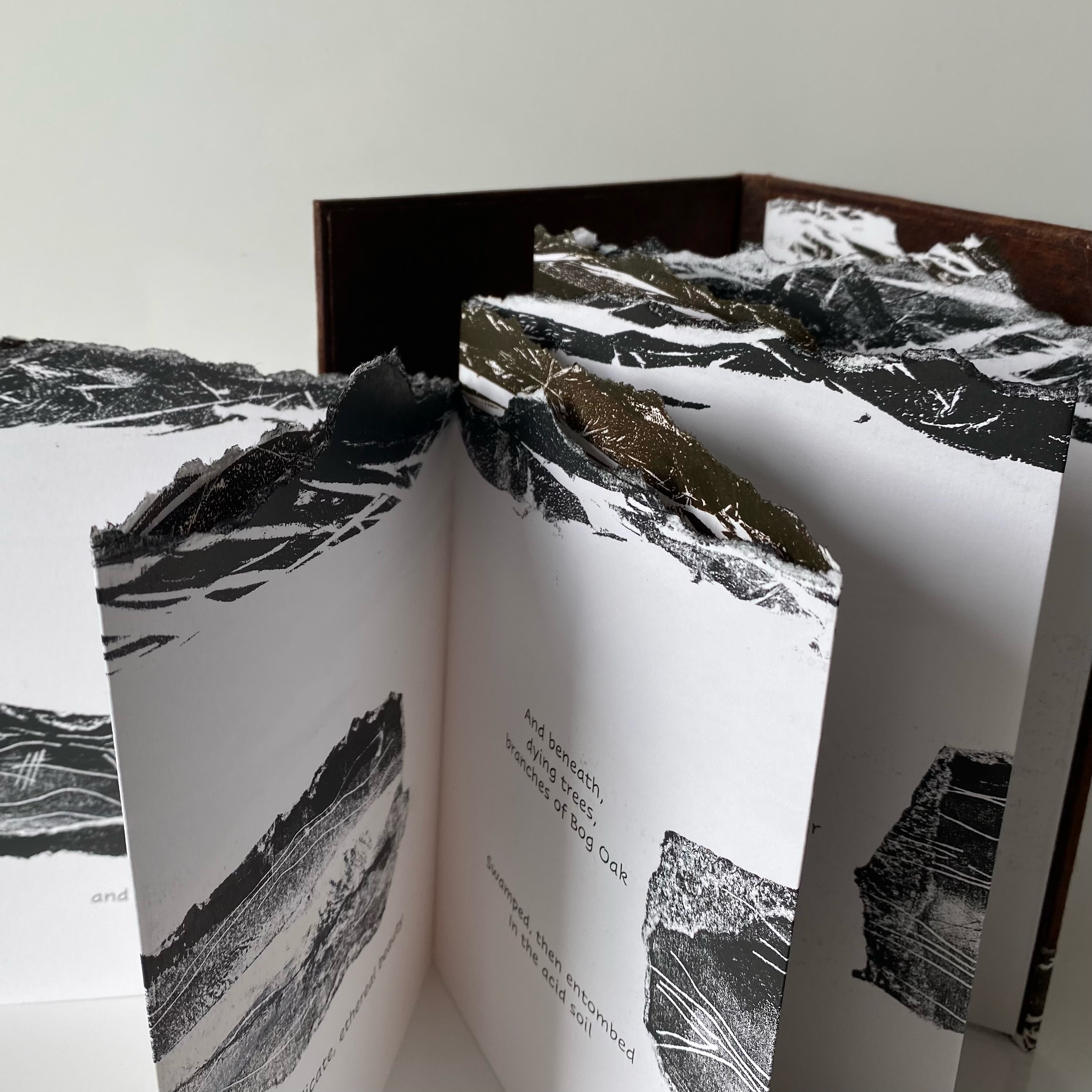 Joan is a Book Artist and Printmaker. Her current work draws upon language, memory and place – particularly the landscapes of Yorkshire and Ireland. She uses mono printing, collage and ink to create and bind artist books.